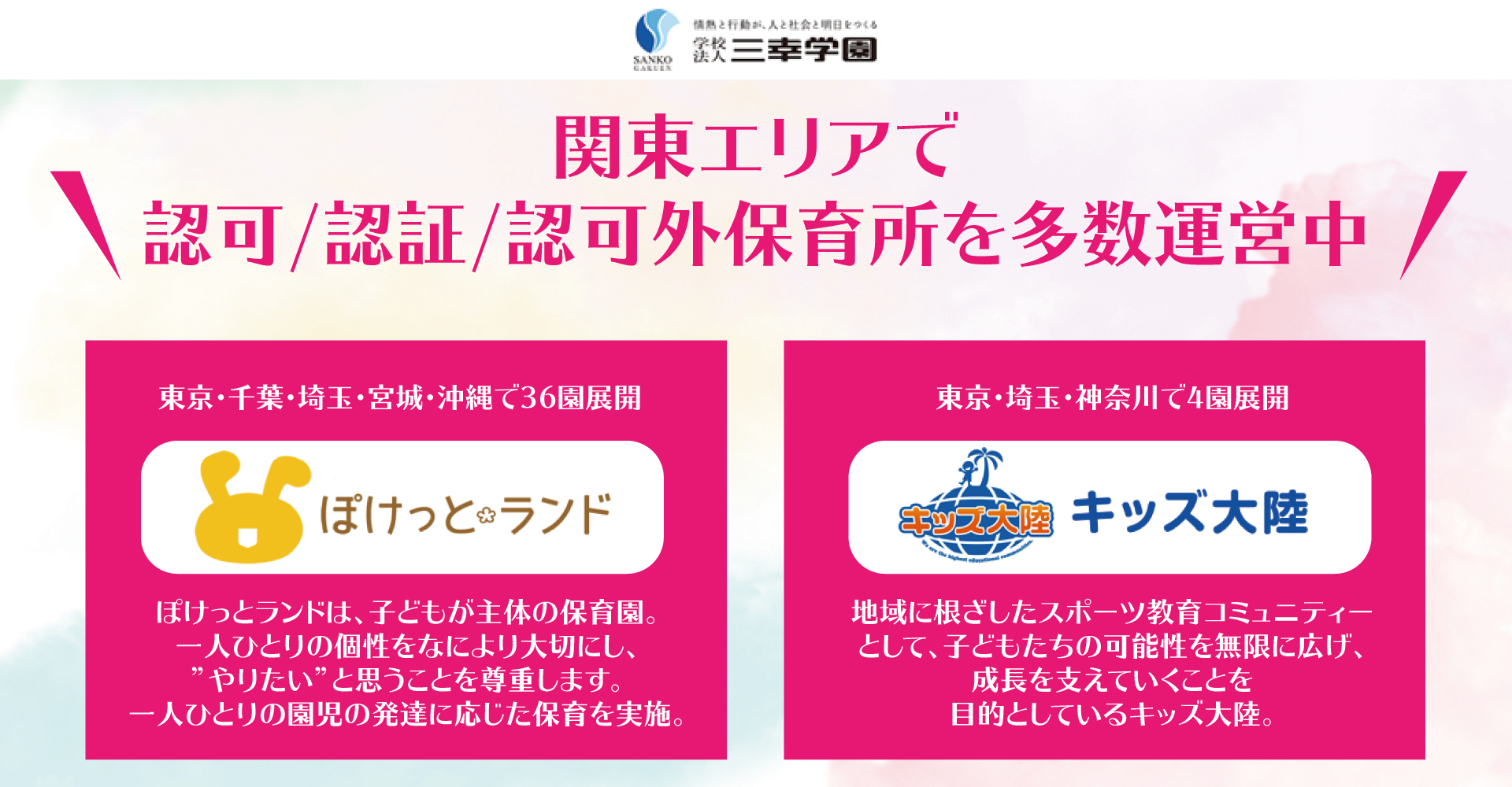 | 関連施設 | 経営法人:学校法人三幸学園 保育園一覧―――――――――――― ぽけっとランド本郷 ぽけっとランドさぎのみや ぽけっとランド雷門 ぽけっとランド国領 ぽけっとランド入谷 ぽけっとランド王子 ぽけっとランド仙川 ぽけっとランド船堀 ぽけっとランドひばりヶ丘 ぽけっとランド西新井 ぽけっとランド亀有 ぽけっとランド南千住 ぽけっとランド北赤羽 ぽけっとランド千住曙町 ぽけっとランド浅草タワー ぽけっとランド信濃町 ぽけっとランド南沢 ぽけっとランド中野坂上 ぽけっとランドパークタワー豊洲 ぽけっとランド千歳船橋 ぽけっとランド綾瀬 ぽけっとランドあびこ保育園 ぽけっとランド深大寺保育園 ぽけっとランド江戸川台駅前保育園 ぽけっとランド南千住瑞光保育園 ぽけっとランド市ヶ谷保育園 ぽけっとランド明石町保育園 ぽけっとランド西蒲田保育園 ぽけっとランド浅草橋保育園 東京こども保育園 ぽけっとランド赤羽保育園 仙台こども保育園 ぽけっとランド立川保育園 千葉こども保育園 沖縄こども保育園 札幌こども保育園 広島こども保育園 ――――――――――――――――――――― |