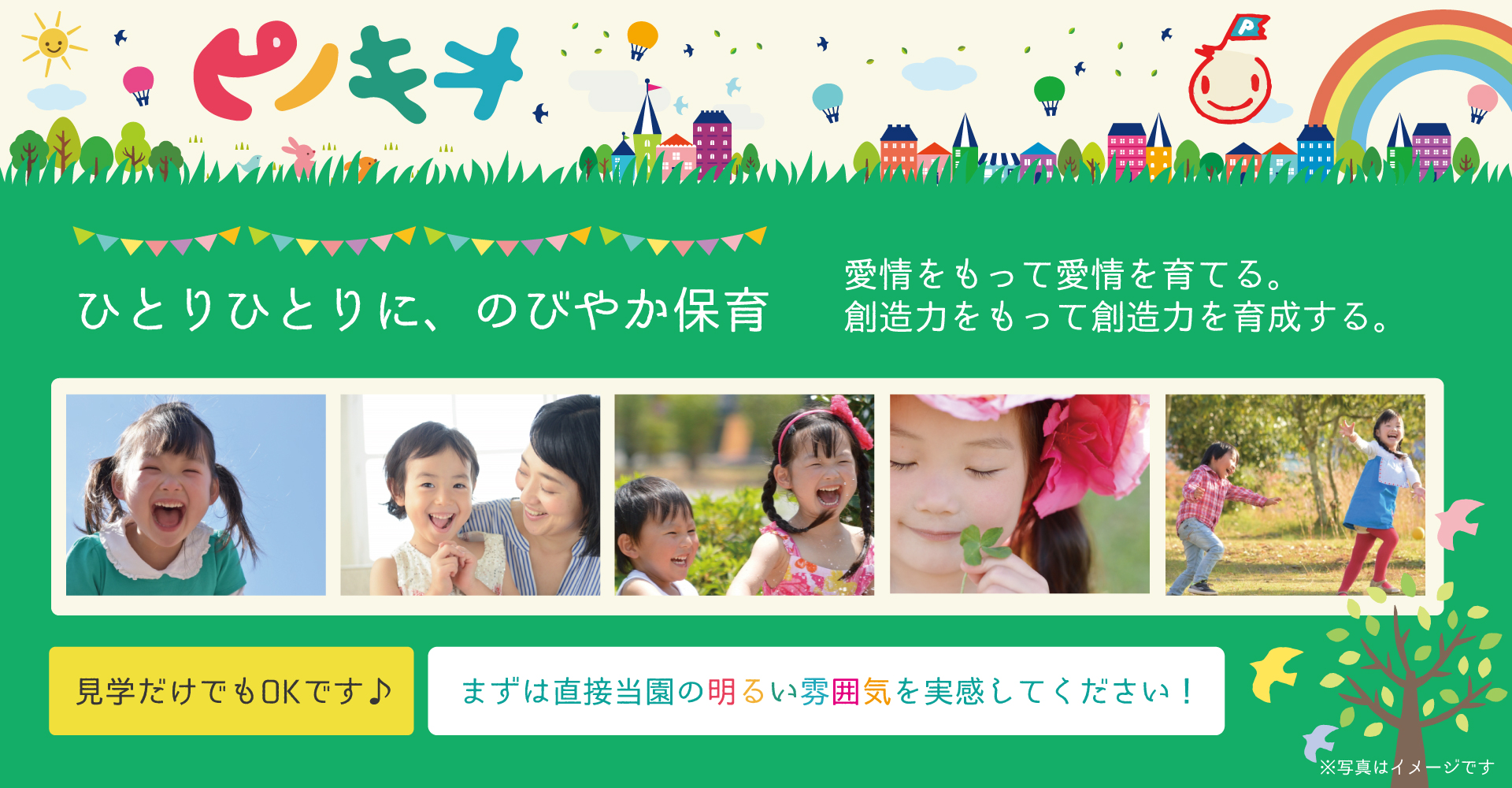 | 施設の特徴・詳細 | 『ひとりひとりに、のびやか保育』を掲げる 【ピノキオ幼児舎】 愛情をもって愛情を育てる。 創造力をもって創造力を育成する。 子どもたちはひとりひとり、大きな発達と成長の可能性を持っています。 特に乳幼児期は将来の人間形成の原点となる大切な時期です。 ピノキオ幼児舎は、お母さん・お父さんの協力者として、このかけがえのない時期に最良の保育サービスと幼児教育を提供することを目指します。 ピノキオの保育・教育理念、それはいわゆる“良い子” “できる子” にすることではありません。 従来の保育と教育の垣根にとらわれず、ひとりひとりの子どもを愛情をもって見つめ、適切なケアをすることにより、意欲と思いやりを持ち、好奇心に溢れる元気な子どもを数多く育てること、それが私たちの願いです。 ピノキオ幼児舎は、子どもたちがのびのびと成長し、ご両親が安心して預けることができる良質な保育園を目指しています。 ★小規模保育を実施し、子ども達それぞれに寄り添える 環境だからこそ、余裕を持ち行き届いた保育ができるんです。 自分の家庭を優先しながら働けるので、 無理がありません。 自転車通勤が可能なので、 仕事終わりに夕飯の買い物にも行けますよ♪ ブランクから復帰した 30~40代の主婦さんなど幅広い世代が在籍中。 お互いに仕事からシフトまで、 フォローし合える温かい保育園です♪ 見学だけでもOKなので、まずは直接 当園の明るい雰囲気を実感してください★ このたびは当社の職員募集案内をご覧いただきありがとうございます。 少人数制の保育にて”のびやか保育”をモットーに、子どもたちの成長を見守ってきました。今後もより多くの子どもたちと向き合い、保育の質を更に向上させていくため2018年度の保育士をはじめとする職員の募集を行っています。 “子どもたちにとって…” これは保育士ならば誰でも抱く想い。私たちは保育士のそんな想いを形にして欲しいと願い、最適な保育環境を提供しています。私たちと一緒に「心と身体の育ちの支援」をしていただける方を、心よりお待ちしています。 |