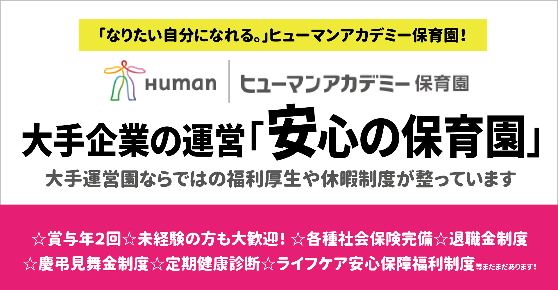「なりたい自分になれる。」ヒューマンアカデミー保育園!介護・保育・人材の事業を日本全国で展開する大手企業の運営「安心の保育園」で安心勤務♪ヒューマンの保育園第一号として地域の皆様に支えられながら3年目を迎えました。 大手運営園ならではの福利厚生や休暇制度が整っています☆未経験の方も大歓迎!
